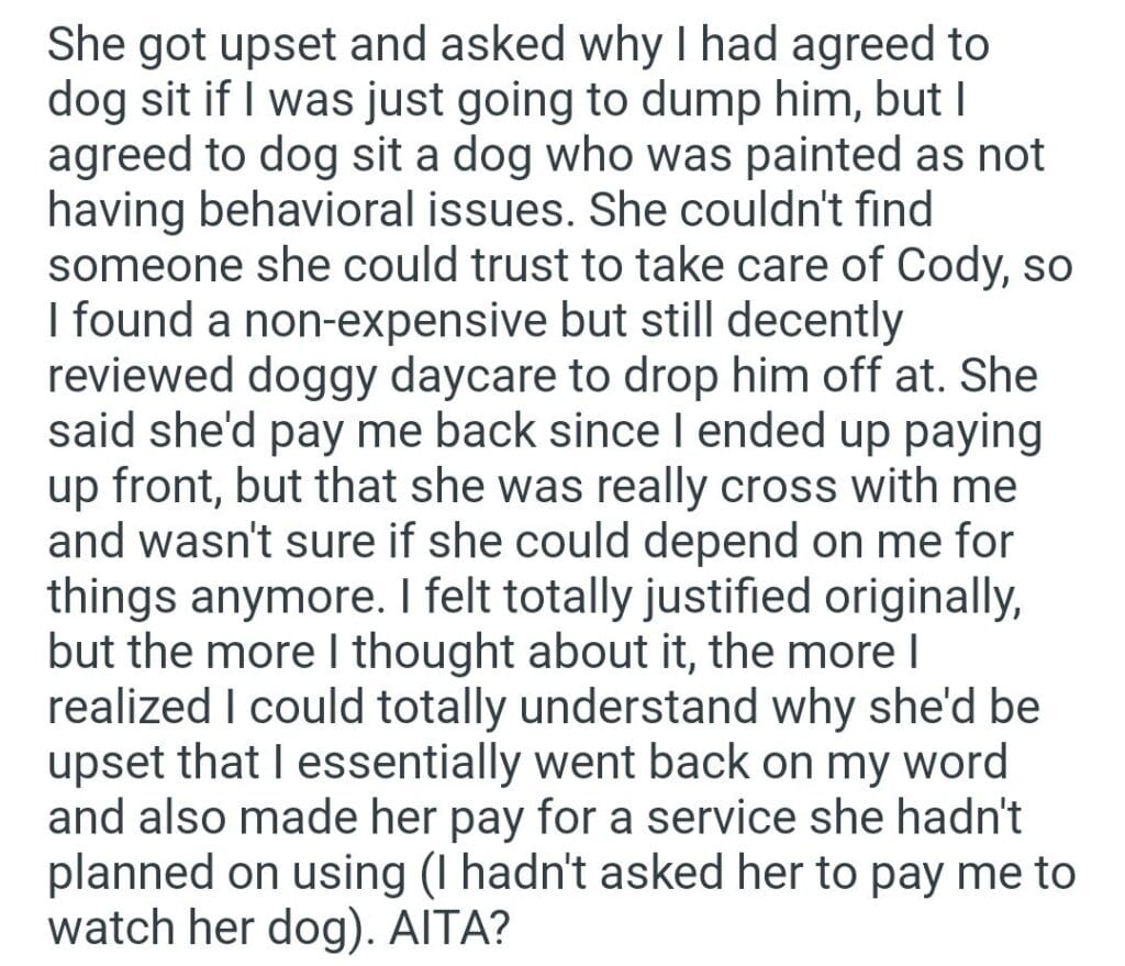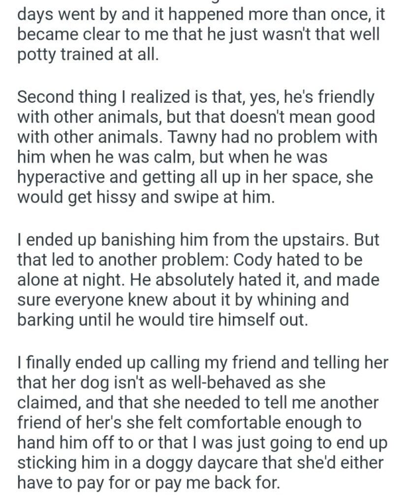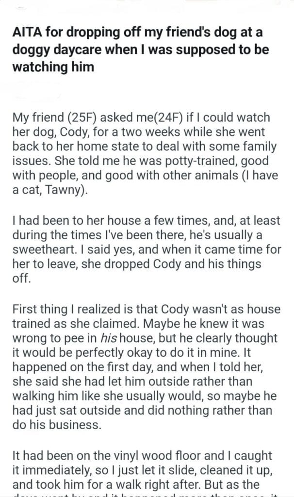 my friend’s dog Related Posts walk the dog my wedding guests refinance the car he left me something she gave away my work hours listen to my husband my wife’s pregnancy my cousin for a “prank” dog for my Daughter reporting a teacher my property for not speaking Call Animal Control my bathroom sister of my father’s not judgement
