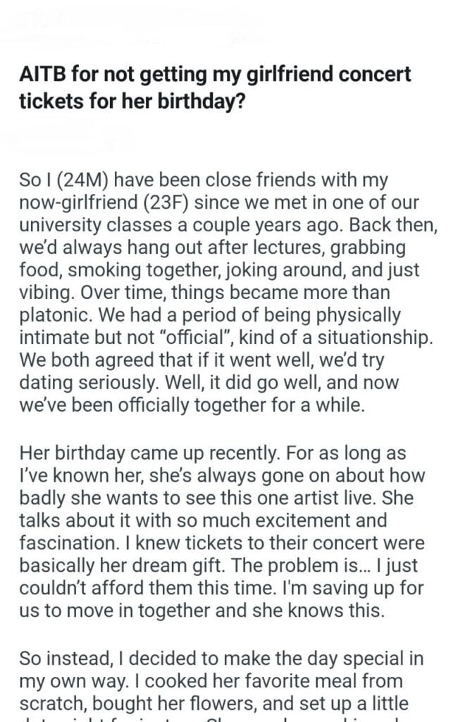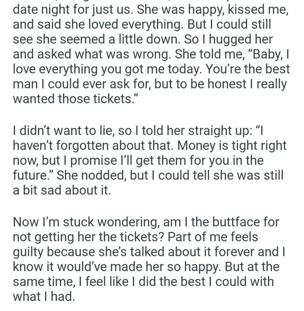 my girlfriend concert tickets Related Posts my dog’s puppies’ vet bills a child with my girlfriend my friend stay in my second property my parents marriage by finding my bio father Because I’m the woman AITAH for telling my BIL that helping I didn’t AITA for demanding my colleagues my GF’s phone AITAH for telling my SIL daughter lives for free with us AITA for changing the wedding venue my fiancé her parent can’t live with us my husband’s friend to stay in our house picking her up at the airport at 3AM