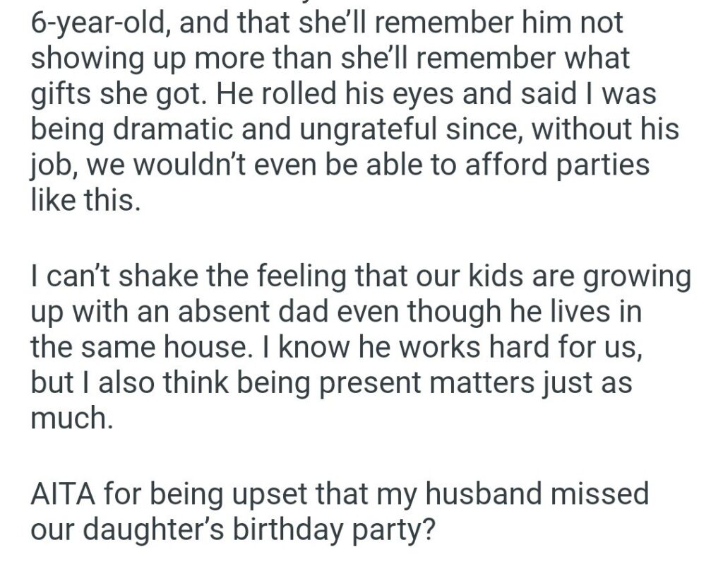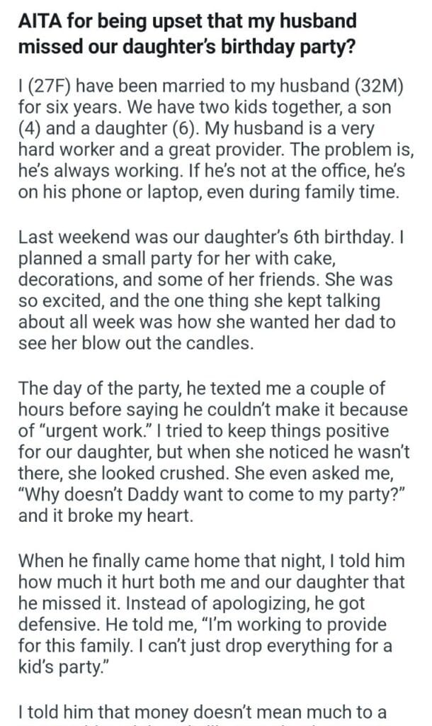 my husband missed our daughter’s birthday party Related Posts my dog’s puppies’ vet bills a child with my girlfriend my friend stay in my second property my parents marriage by finding my bio father Because I’m the woman AITAH for telling my BIL that helping I didn’t AITA for demanding my colleagues my GF’s phone AITAH for telling my SIL daughter lives for free with us AITA for changing the wedding venue my fiancé her parent can’t live with us my husband’s friend to stay in our house picking her up at the airport at 3AM
