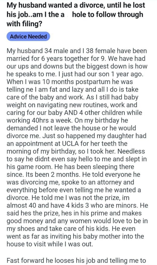 My husband wanted a divorce Related Posts deciding to separate our finances my sister to babysit HOA is asking us my in-laws to respect my way 15,000 out of my daughters college fund my dog’s puppies’ vet bills a child with my girlfriend my friend stay in my second property my parents marriage by finding my bio father Because I’m the woman AITAH for telling my BIL that helping I didn’t AITA for demanding my colleagues my GF’s phone AITAH for telling my SIL