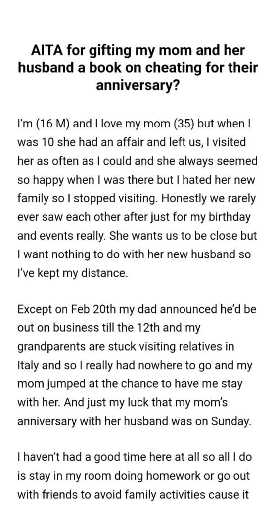 my mom and her husband Related Posts My boyfriend 22M for all my nephew and nieces my ex-wife’s child ex showed up my fiancé’s best man leave my fiancee my 4 year old my friends kids combining income her looks tipping 83 my GF (29F) of 5 years keeping 700 my son that his cat’s