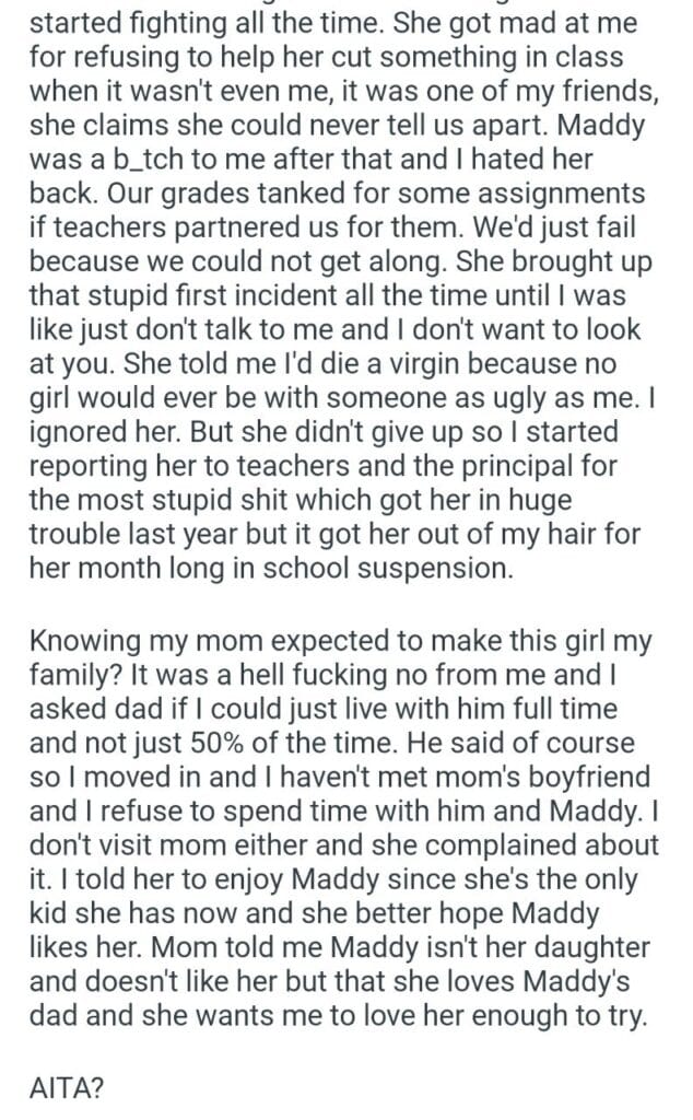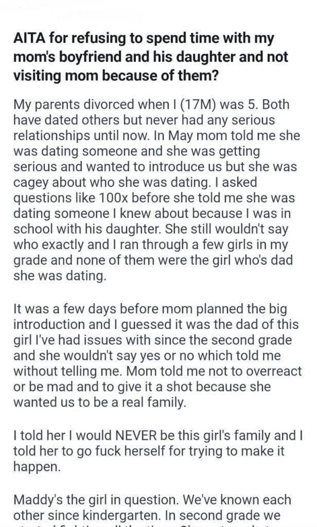 my mom’s boyfriend and his daughter Related Posts cousin on the family hike my MIL the water my baby middle name 10 days before the wedding Mil’s at my wedding AITA: Named my son my step-son’s college fund on a hike the concert ticket I bought my friend AITA for telling my future sister in law Thanksgiving Halloween or Christmas this year for getting a dog my workout routine Boyfriend doesn’t want to propose My (24F) BF (27M) booked our tickets