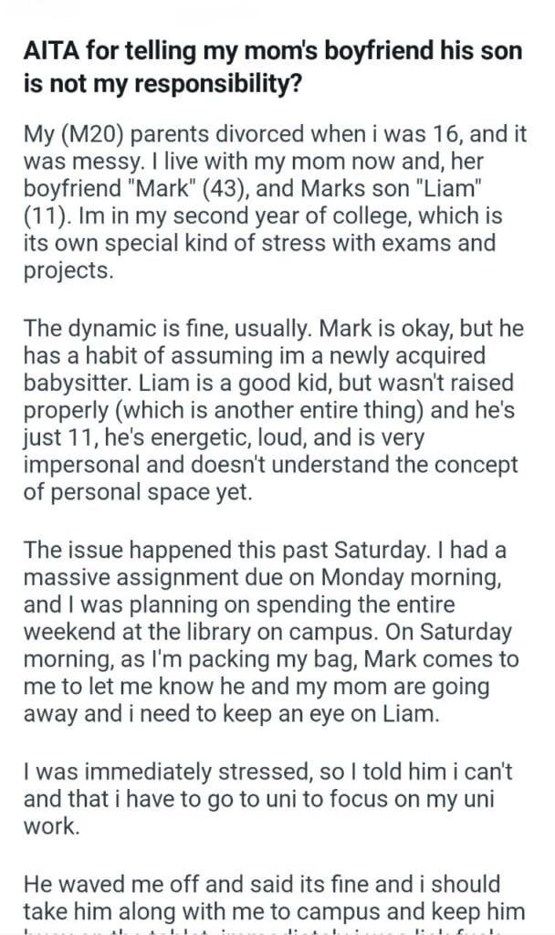 my mom’s boyfriend his son Related Posts telling my wife’s family my fiancè handed my husband’s family to stay my children’s stepsiblings to certain things my brother his girlfriend is the reason ask my employee telling my neighbor and HOA after I found out wedding invitation after accepting my fiance’s family gifts my brother(and wife) My Husband and I My (24f) boyfriend (31m) for taking my kids