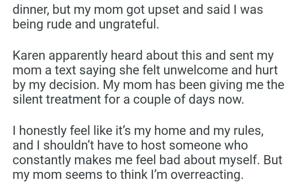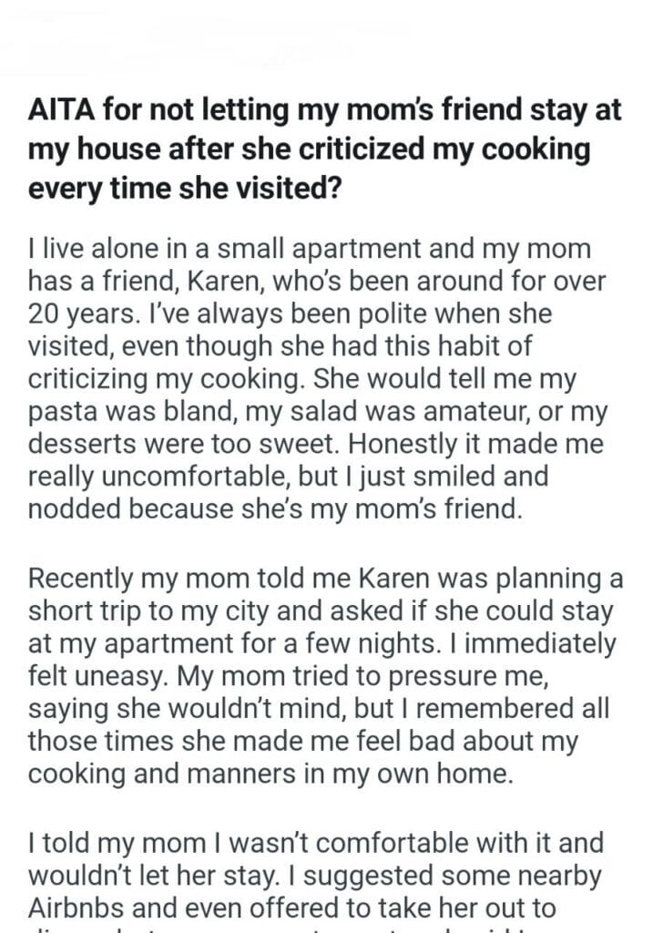 my mom’s friend Related Posts for wanting a test meal at a restaurant my friend in front my bachelorette party quitting” my marriage AITA for telling my mom my gf job for apparently being my dads wedding the “family-friendly” wedding my husband was home her husband isn’t AITA Roomate decided my half and step siblings his entire family