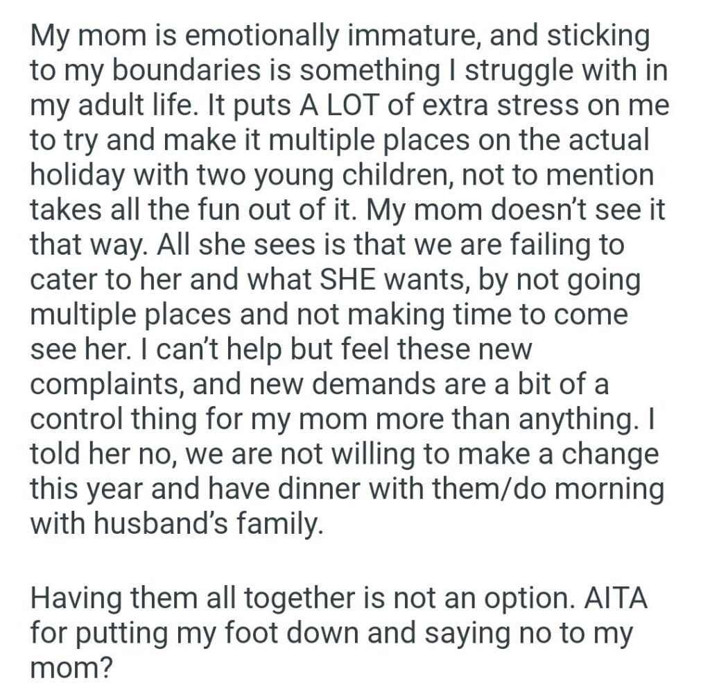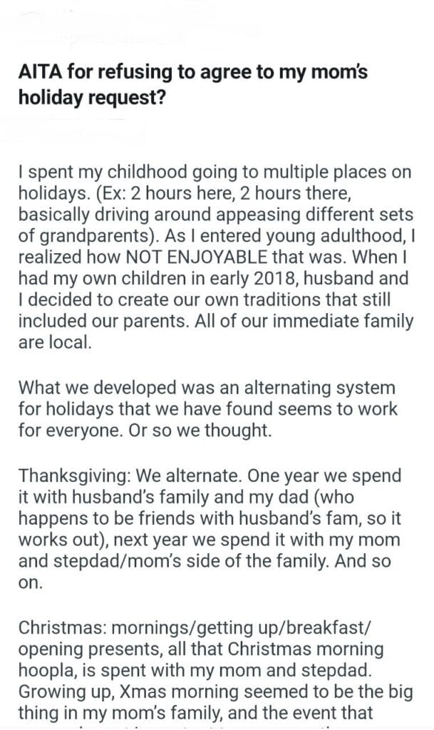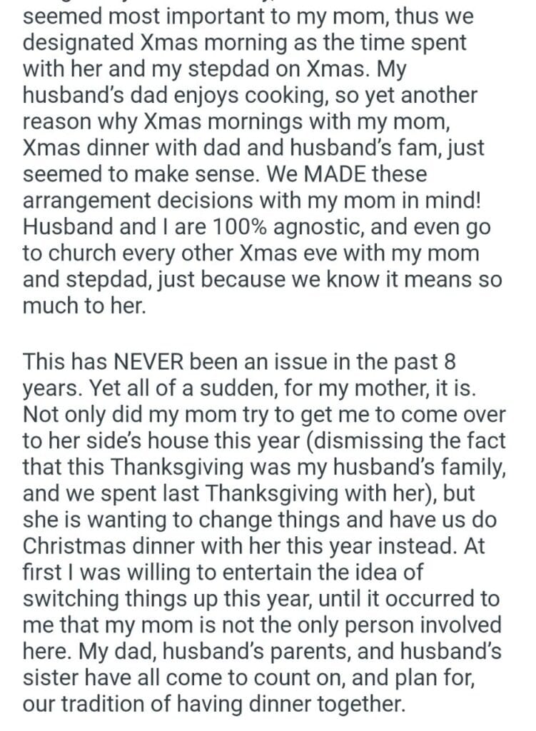my mom’s holiday request Related Posts the new tires for properly father deserves at the hospital a month before Christmas my sister’s engagement party leaving my bf My neighbor that the reason mashed potatoes five years later overnight visitors birthday bbq my son (18) my (29m) online my inlaws’ christmas