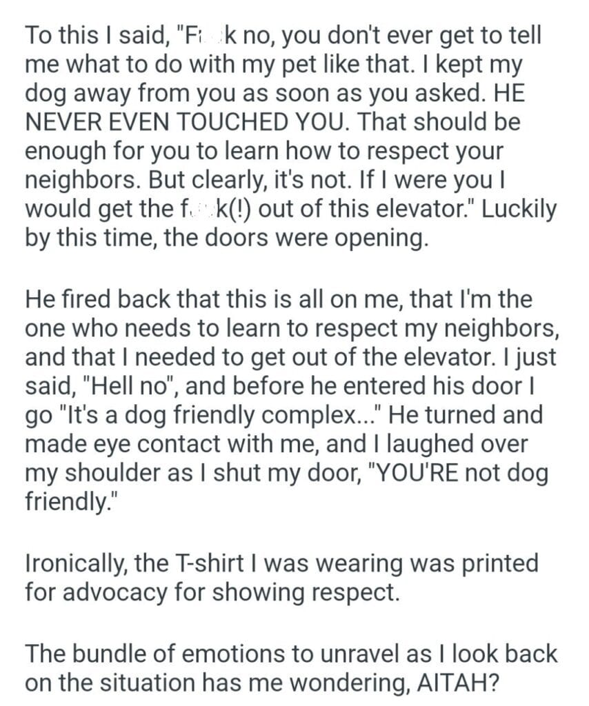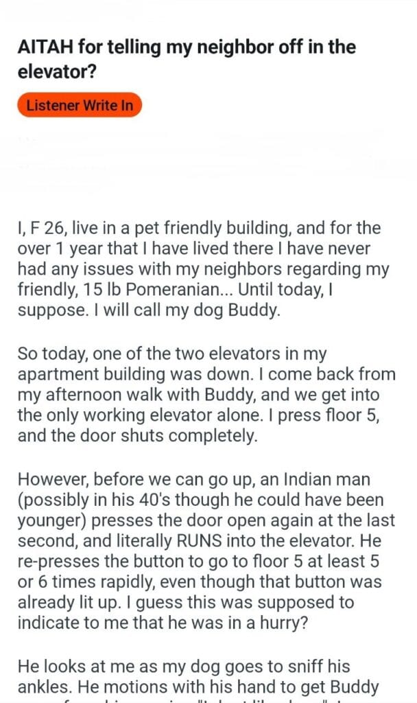 my neighbor in the elevator? Related Posts AITAH for telling my BIL that helping I didn’t AITA for demanding my colleagues my GF’s phone AITAH for telling my SIL daughter lives for free with us AITA for changing the wedding venue my fiancé her parent can’t live with us my husband’s friend to stay in our house picking her up at the airport at 3AM my bf over Mariokart what my neighbor did my Dad and his wife after they refused my girlfriends wigs my GF did and asking for space