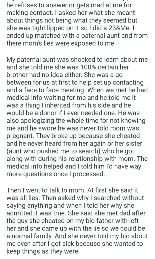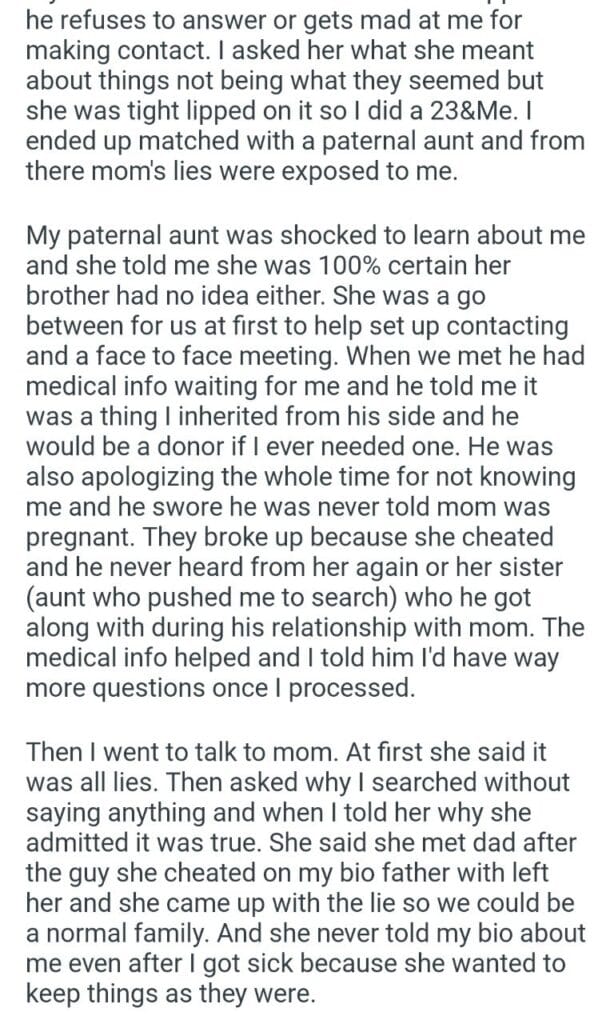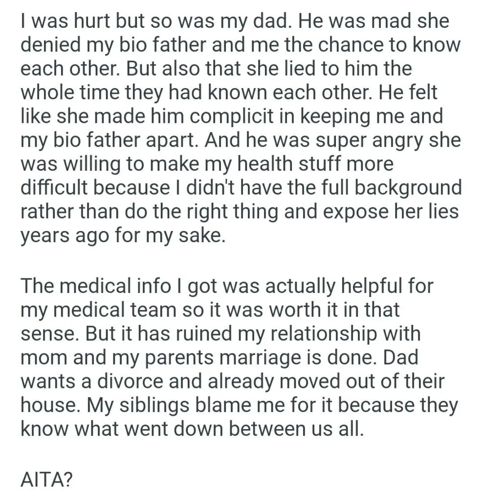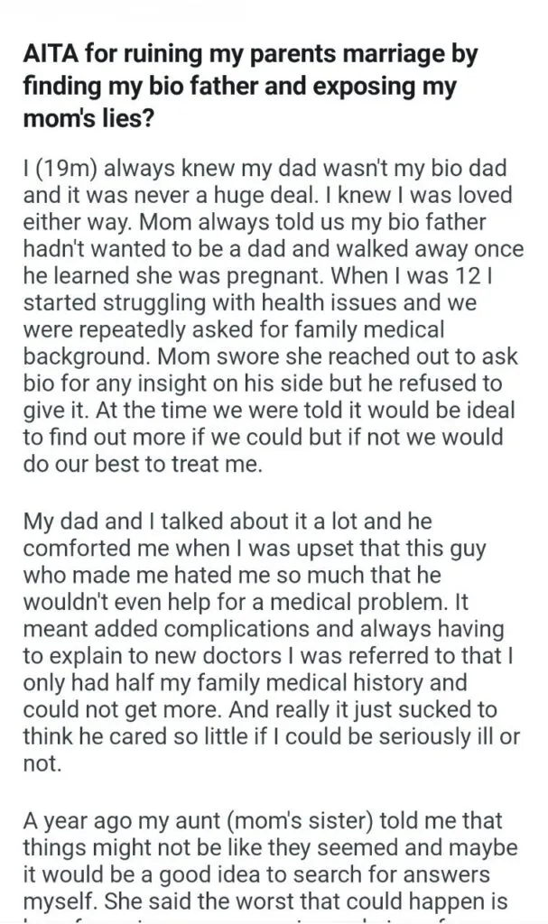 my parents marriage by finding my bio father Related Posts my dog’s puppies’ vet bills a child with my girlfriend my friend stay in my second property Because I’m the woman AITAH for telling my BIL that helping I didn’t AITA for demanding my colleagues my GF’s phone AITAH for telling my SIL daughter lives for free with us AITA for changing the wedding venue my fiancé her parent can’t live with us my husband’s friend to stay in our house picking her up at the airport at 3AM my bf over Mariokart