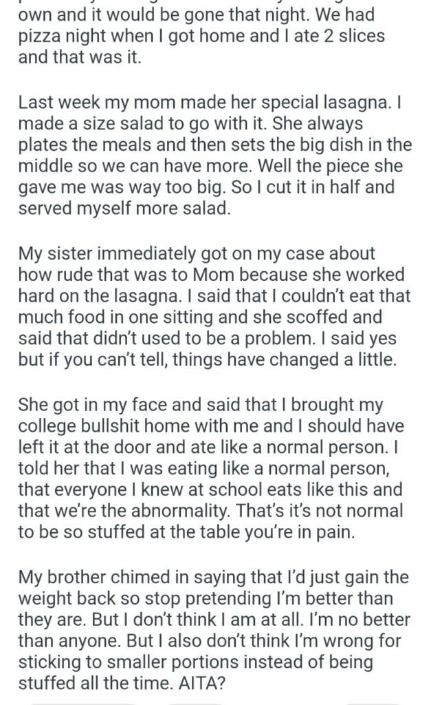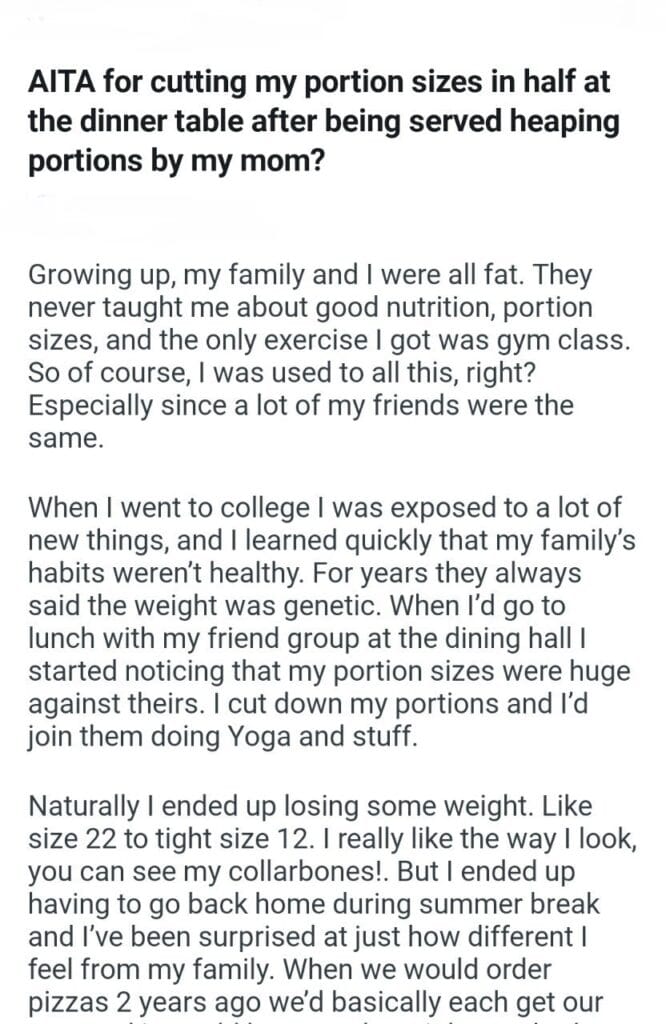 my portion sizes in half Related Posts WIBTA if i told my roommate they retired without planning reaching out to my sister daughter and step daughter separate account my sister in law needing the help AITA. I made my daughter (11) what I did to my stepmother the Shelf that was gifted to my kids by MIL deciding to separate our finances my sister to babysit HOA is asking us my in-laws to respect my way 15,000 out of my daughters college fund my dog’s puppies’ vet bills