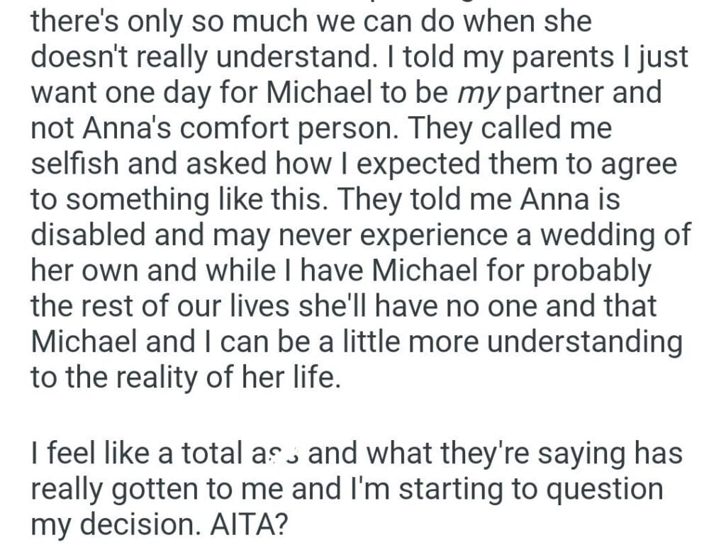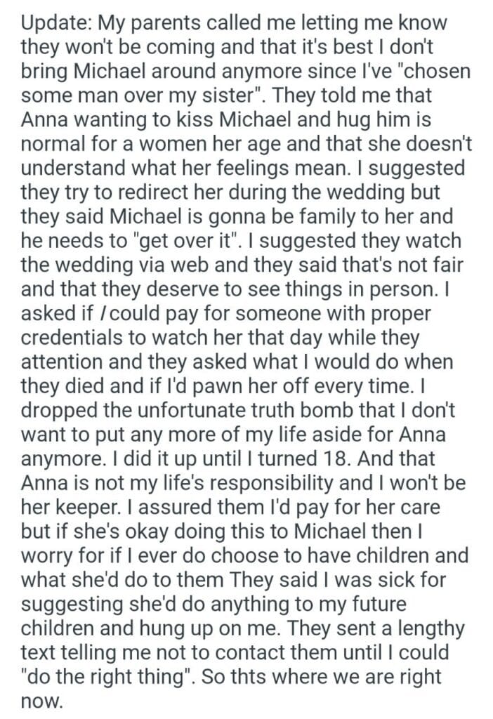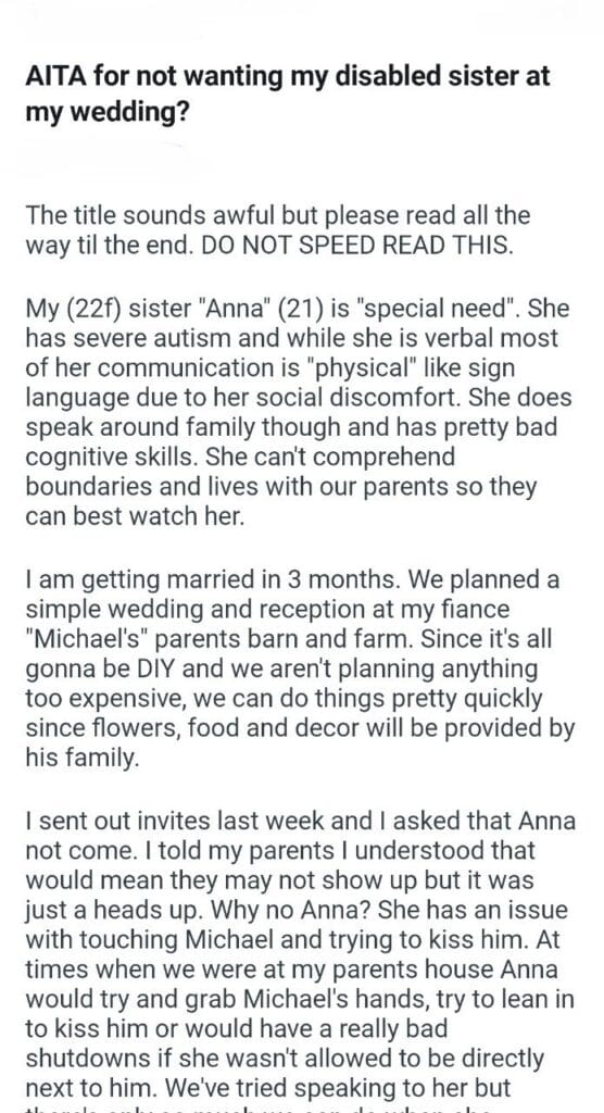 my sister at my wedding Related Posts my dog’s puppies’ vet bills a child with my girlfriend my friend stay in my second property my parents marriage by finding my bio father Because I’m the woman AITAH for telling my BIL that helping I didn’t AITA for demanding my colleagues my GF’s phone AITAH for telling my SIL daughter lives for free with us AITA for changing the wedding venue my fiancé her parent can’t live with us my husband’s friend to stay in our house picking her up at the airport at 3AM