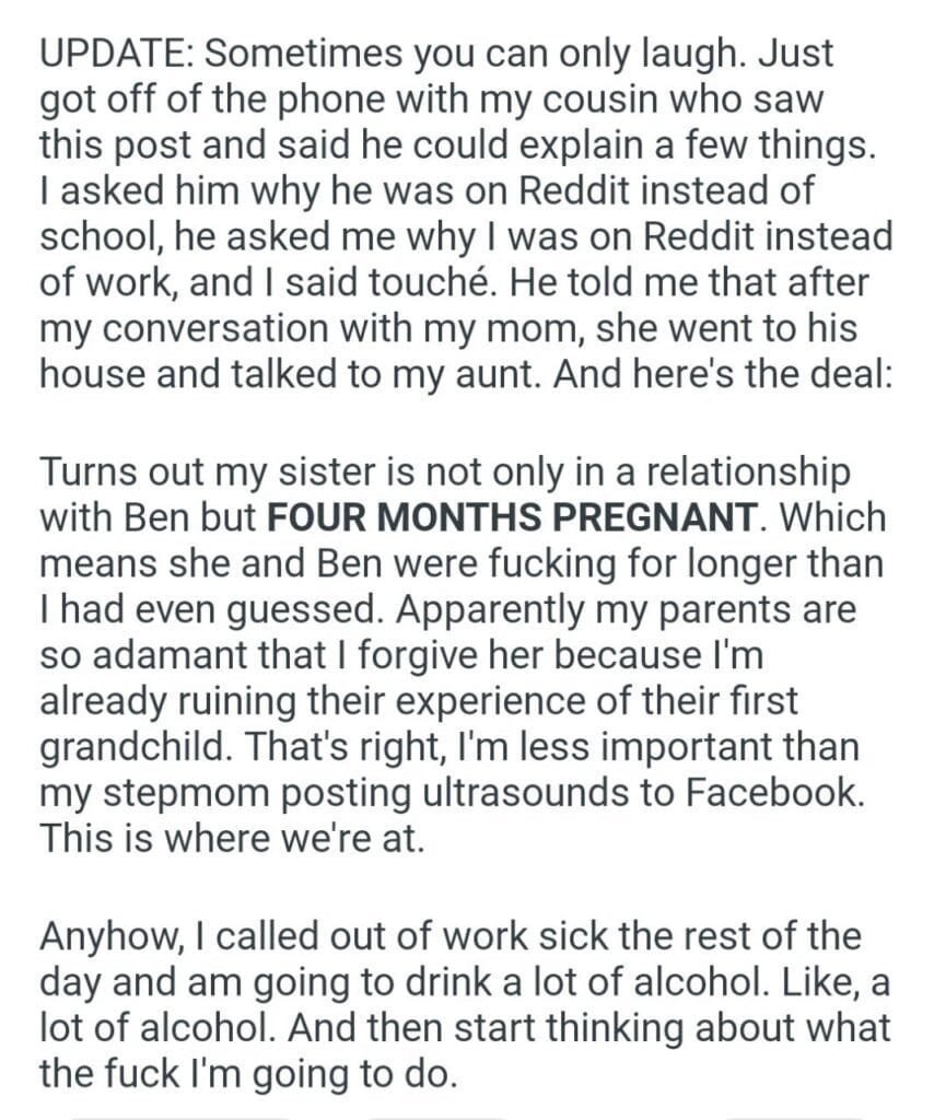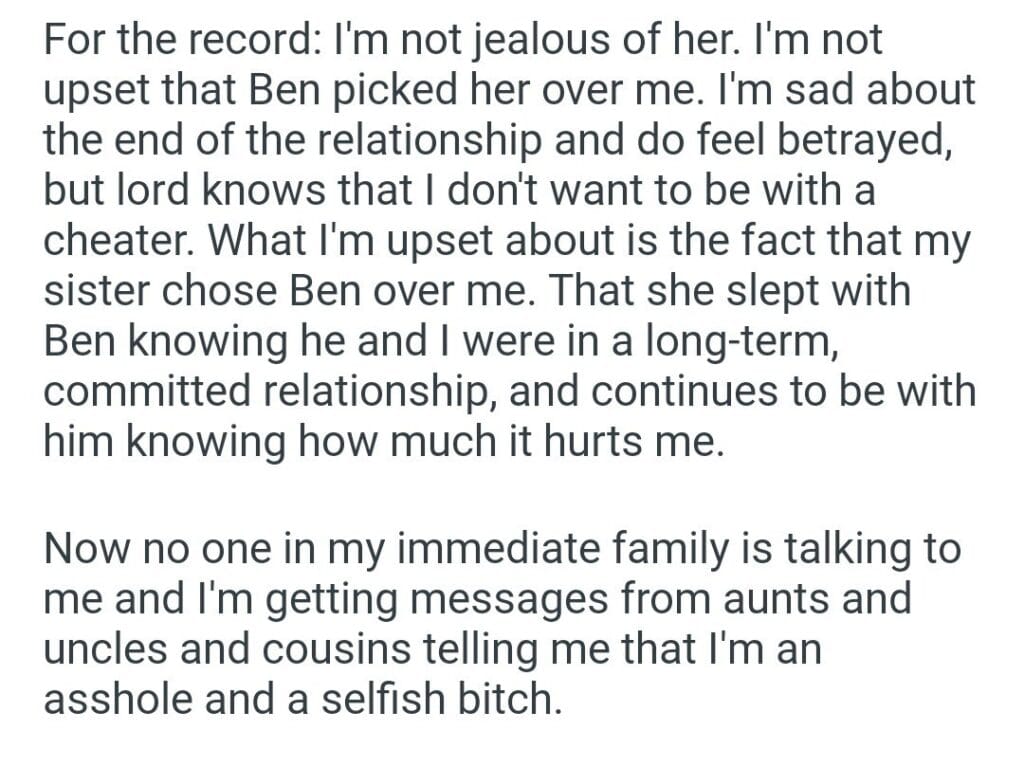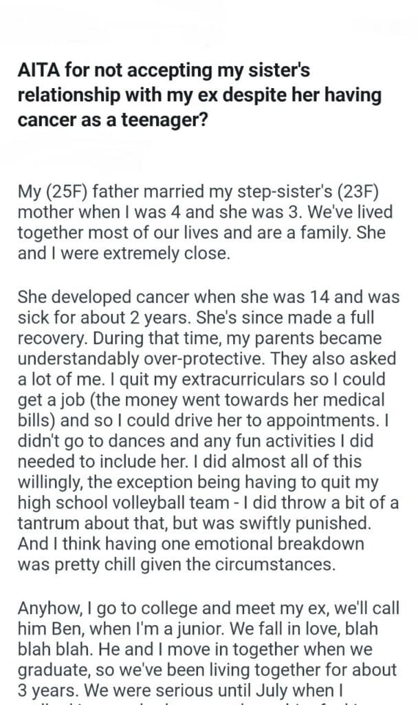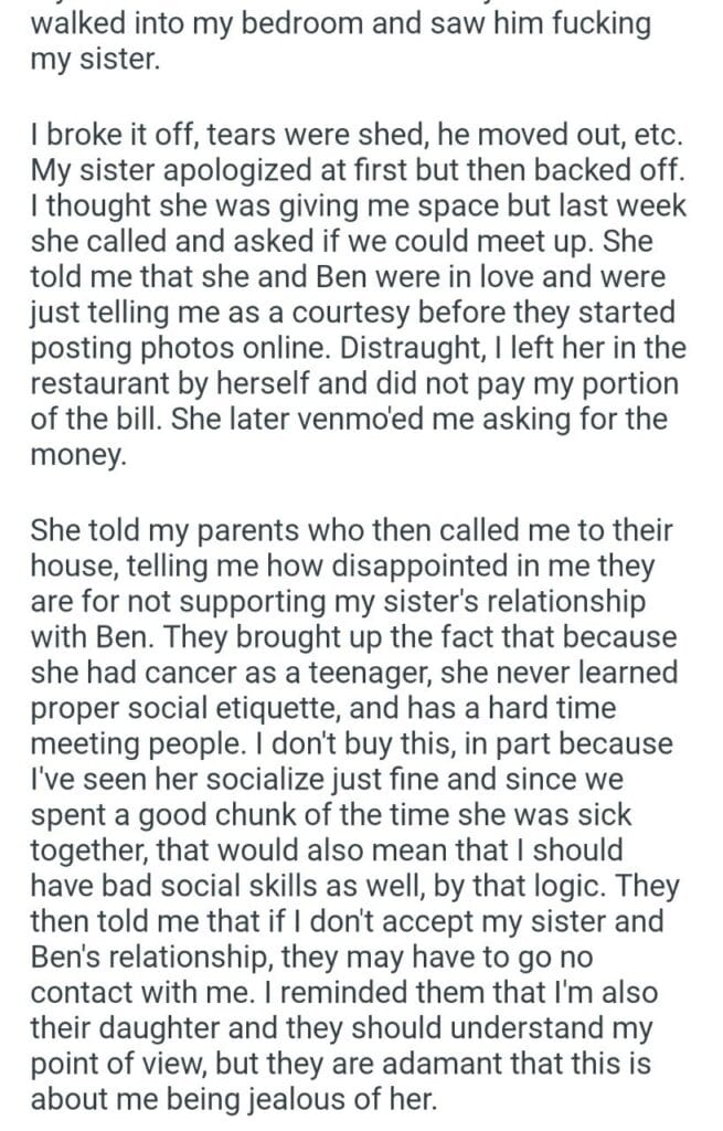 my sister’s relationship with my ex ***UPDATE Related Posts the family I tutor father’s daughter Christmas presents for my step daughter my child’s teacher name my kid my husband’s belongings be a stay-at-home wife changing holiday plans for saying if you my needs over my sister’s (18) boyfriend’s (18) my (35f) friend (36f) private party for calling my friend my best friend’s wedding