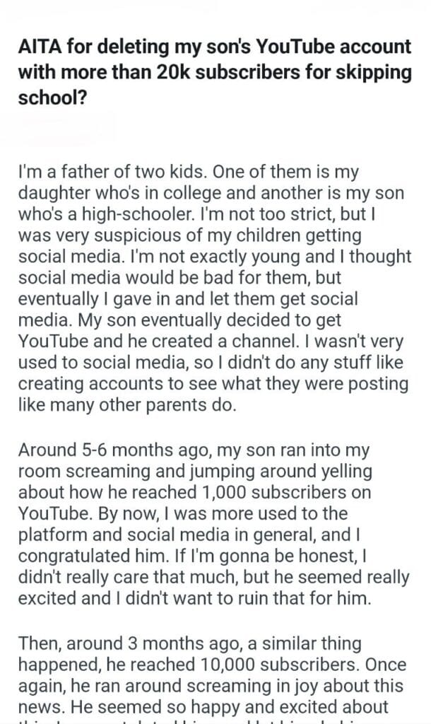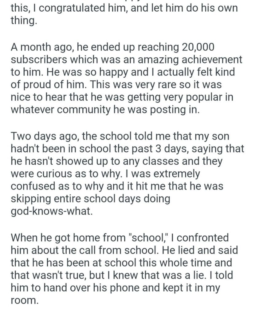 my son’s account Related Posts my partner’s early birthday put my girlfriend my 16yro son eighth baby he went through my phone picture of my husbands wife he expects me to contribute the child my ex-wife had trying to test what I told her my son’s account quiz show my son phone 31 students AITAH for telling my cousin