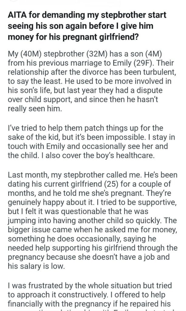 my stepbrother start seeing his son again Related Posts my dog’s puppies’ vet bills a child with my girlfriend my friend stay in my second property my parents marriage by finding my bio father Because I’m the woman AITAH for telling my BIL that helping I didn’t AITA for demanding my colleagues my GF’s phone AITAH for telling my SIL daughter lives for free with us AITA for changing the wedding venue my fiancé her parent can’t live with us my husband’s friend to stay in our house picking her up at the airport at 3AM