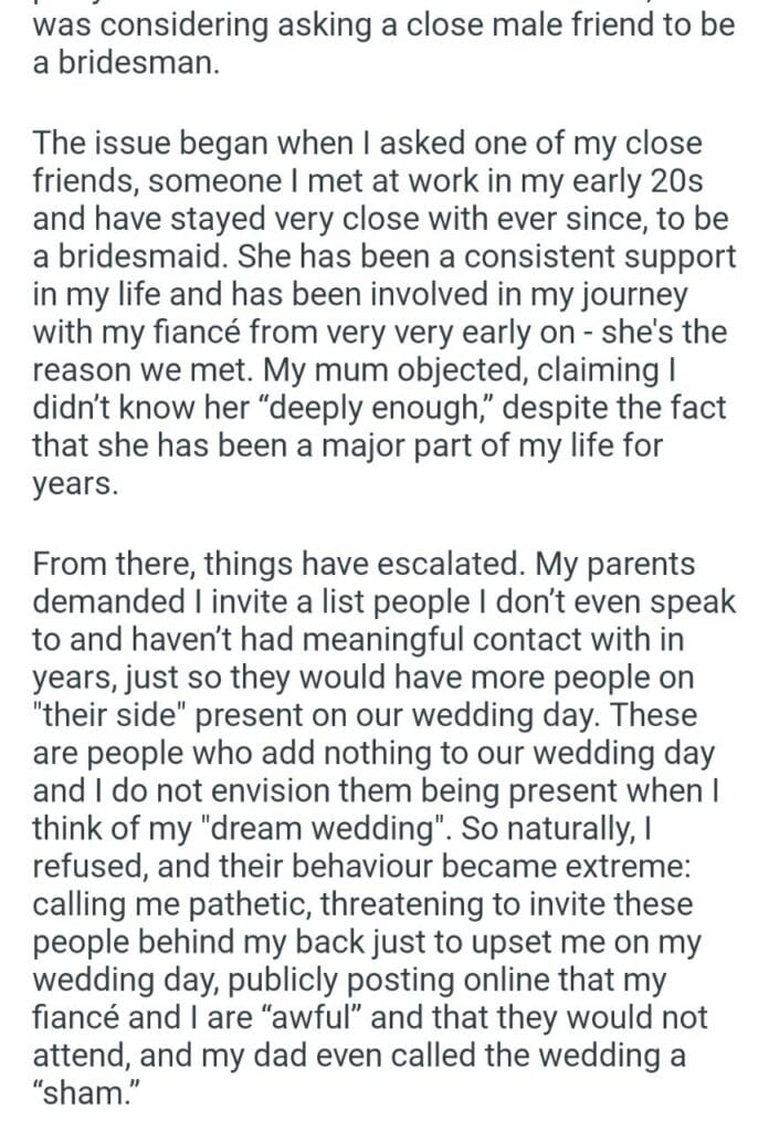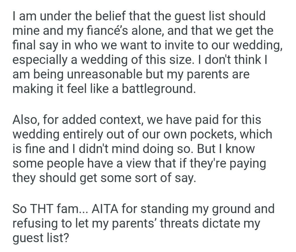my wedding guest list Related Posts when they said my classic car my wife’s behavior a ride tip-out babysitting for my parents show up on time my girlfriend my MIL after go to my sister’s wedding after 5yrs half the rent my SIL service dog bills only what I said to them