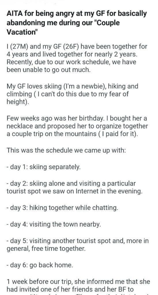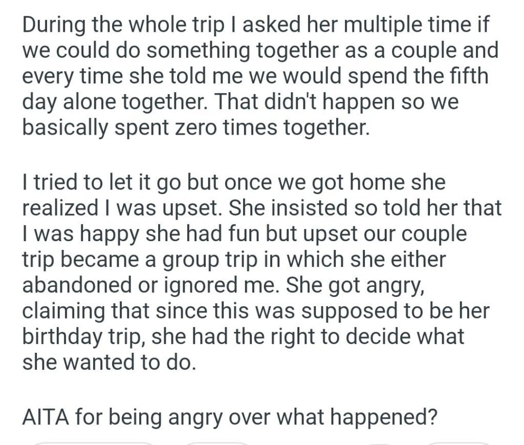 our “Couple Vacation” ***Update Related Posts my friend’s NYE tradition a groomsman trip my dad I’m changing my name my daughter’s BF my SIL of emotional making rules my sister wear my mom’s wedding dress my DIL she wasn’t invited my family’s Christmas dinner a kid’s Christmas calling my sil because of my looks when she gets married my car for work her best friend’s husband