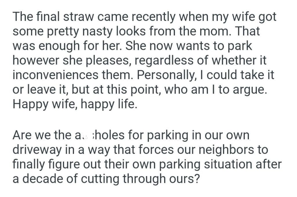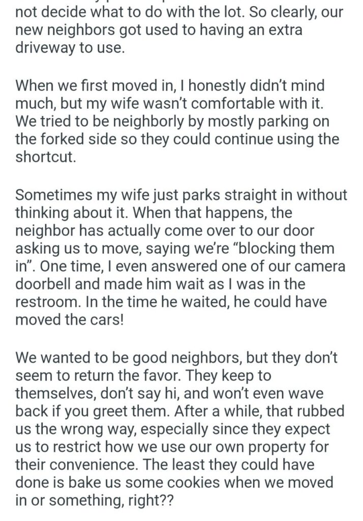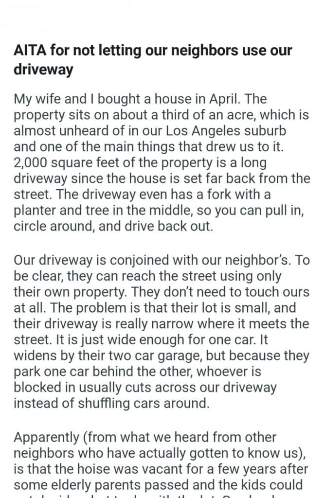 our neighbors use our driveway Related Posts she “didn’t mean to”? AITAH – birth “mother” AITAH for telling my friend/colleague someone else’s meal My wife said something my ex (19F) and now I (19M) my partner everyday my GFs worldview my father’s stepkids AITA for telling my mil Aita for scheduling my fiancé told me “this is it, take it or leave it. for disinviting a coworker my manager couldn’t handle the plans we made in October