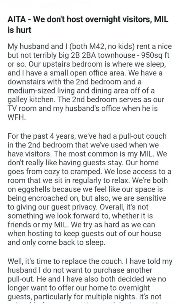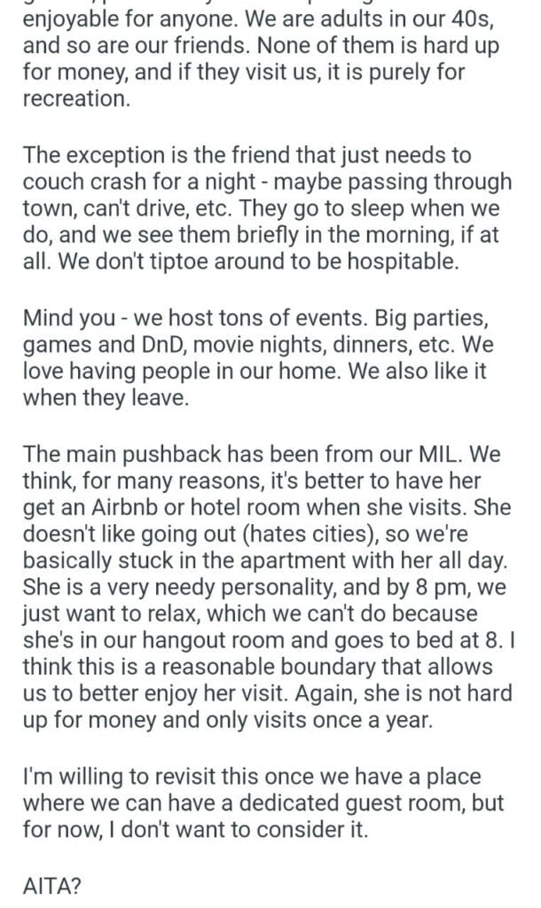 overnight visitors Related Posts a month before Christmas my mom’s holiday request my sister’s engagement party leaving my bf My neighbor that the reason mashed potatoes five years later birthday bbq my son (18) my (29m) online my inlaws’ christmas my son’s mom cabana her behaviour my older brother