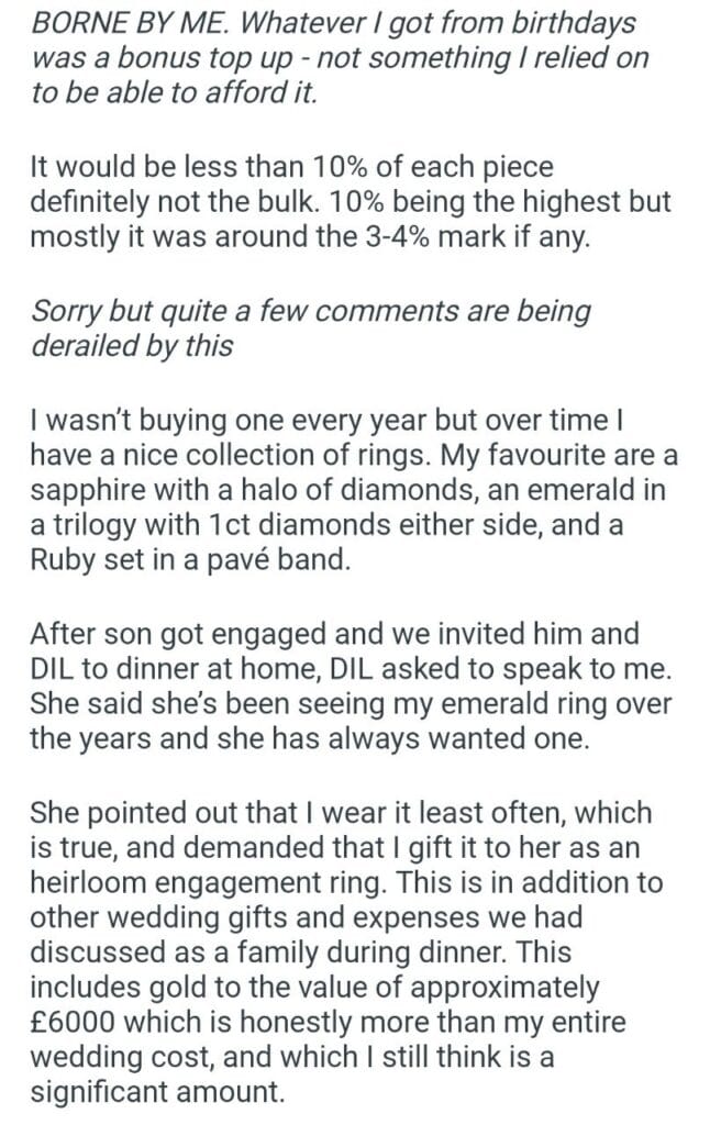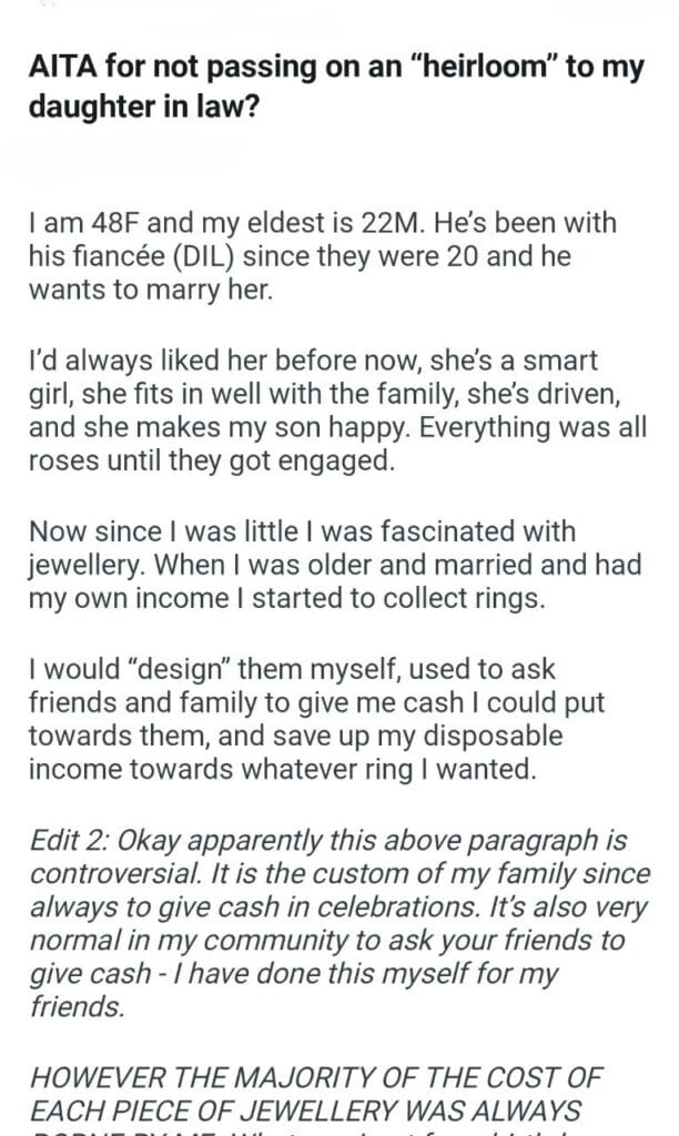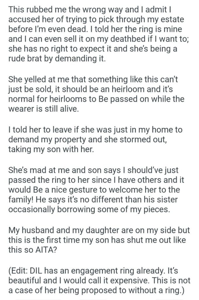 passing on an “heirloom” to my daughter in law Related Posts I told my roommates I wanted to try for being fat sleep in the same bed as my wife extra food on my plate she “didn’t mean to”? AITAH – birth “mother” AITAH for telling my friend/colleague someone else’s meal our neighbors use our driveway My wife said something my ex (19F) and now I (19M) my partner everyday my GFs worldview my father’s stepkids AITA for telling my mil