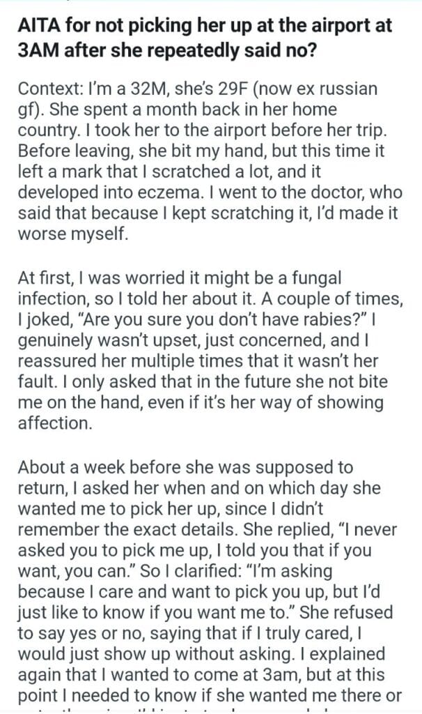 picking her up at the airport at 3AM Related Posts AITAH for telling my BIL that helping I didn’t AITA for demanding my colleagues my GF’s phone AITAH for telling my SIL daughter lives for free with us AITA for changing the wedding venue my fiancé her parent can’t live with us my husband’s friend to stay in our house my bf over Mariokart what my neighbor did my Dad and his wife after they refused my girlfriends wigs my GF did and asking for space AITA for expecting