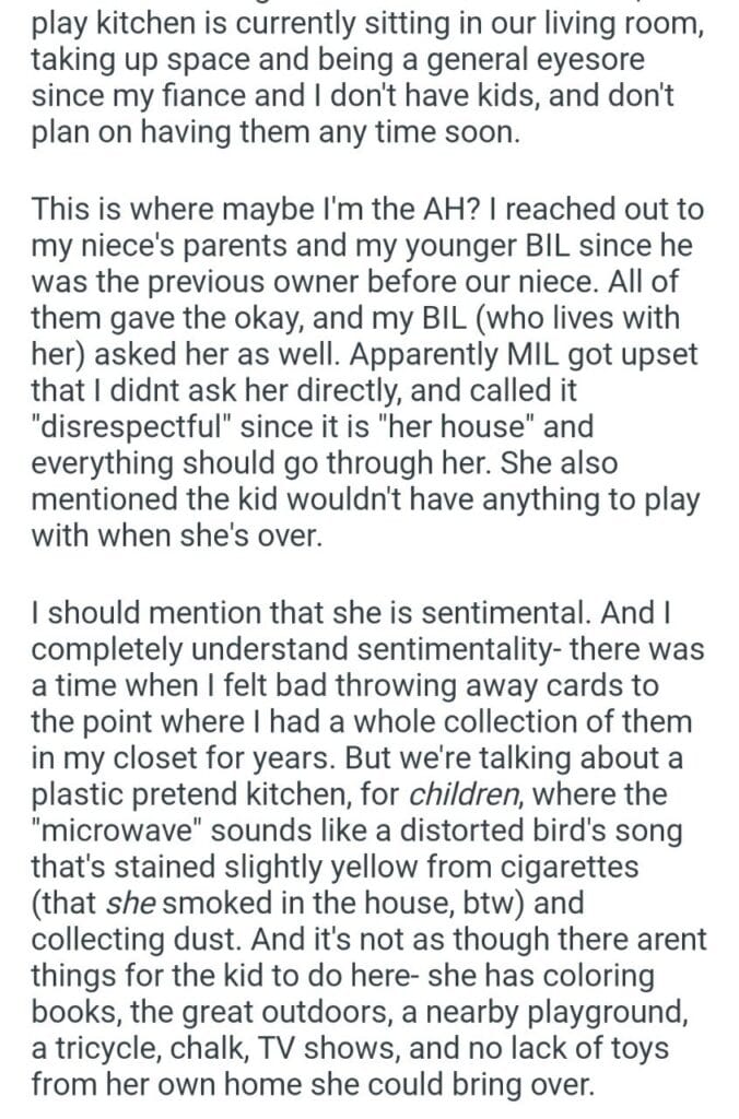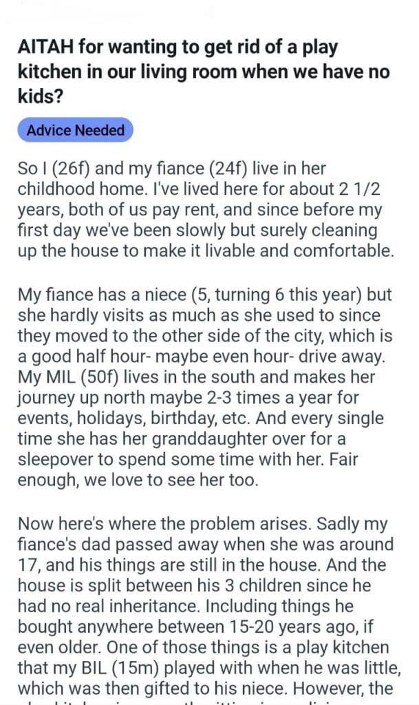 play kitchen in our living room Related Posts Because I’m the woman AITAH for telling my BIL that helping I didn’t AITA for demanding my colleagues my GF’s phone AITAH for telling my SIL daughter lives for free with us AITA for changing the wedding venue my fiancé her parent can’t live with us my husband’s friend to stay in our house picking her up at the airport at 3AM my bf over Mariokart what my neighbor did my Dad and his wife after they refused my girlfriends wigs