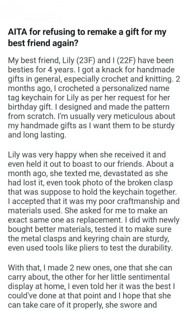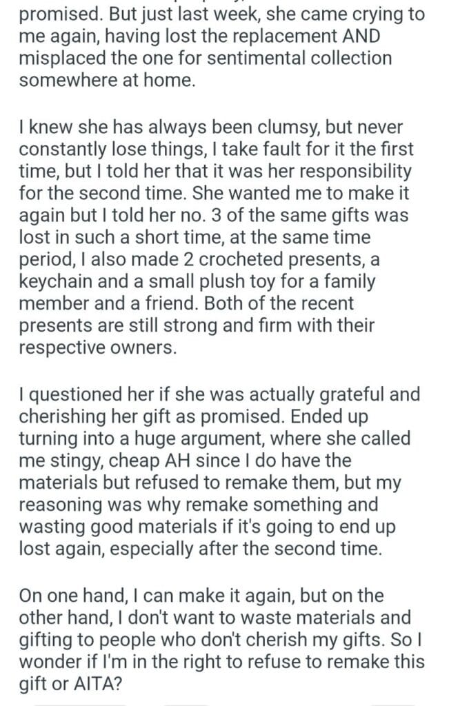 remake a gift for my friend Related Posts AITA for wanting to move abroad my puppy my bf bought teenager parents want to settle privately she keeps wishing our kids had my features WIBTA if I don’t tell my dad my husband and MIL out for being too heavy a sleeper he’ll have to explain to why to her my step-sister borrow my wedding dress I refused because I have two small children. AITAH? what he did to me during my pregnancy I made my kids friend boarding the plane my wife of 5 years wants a divorce reporting my ex and her husband