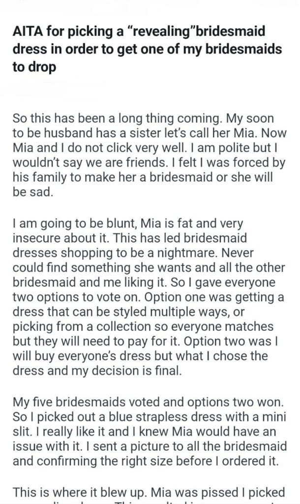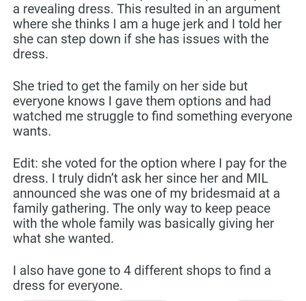 “revealing”bridesmaid dress Related Posts my dog’s puppies’ vet bills a child with my girlfriend my friend stay in my second property my parents marriage by finding my bio father Because I’m the woman AITAH for telling my BIL that helping I didn’t AITA for demanding my colleagues my GF’s phone AITAH for telling my SIL daughter lives for free with us AITA for changing the wedding venue my fiancé her parent can’t live with us my husband’s friend to stay in our house picking her up at the airport at 3AM