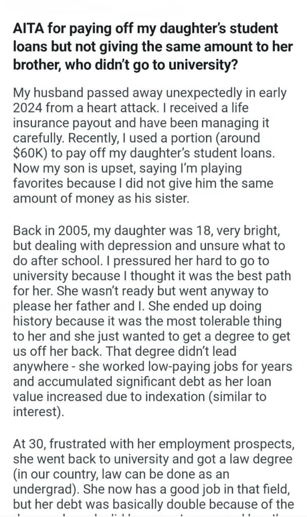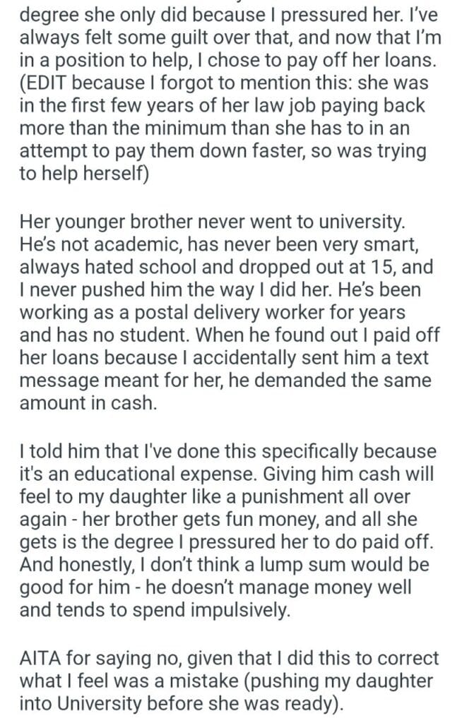 same amount to her brother Related Posts his wife she’s actually pretty funny His inheritance Me [32 M] with my wife [31 F] my tutor 7-year friendship my friend’s boyfriend a nurse for asking AITA- seeking divorce around her husband my friend about her “boyfriend’s something vegetarian Nanny informed my husband left the office fridge