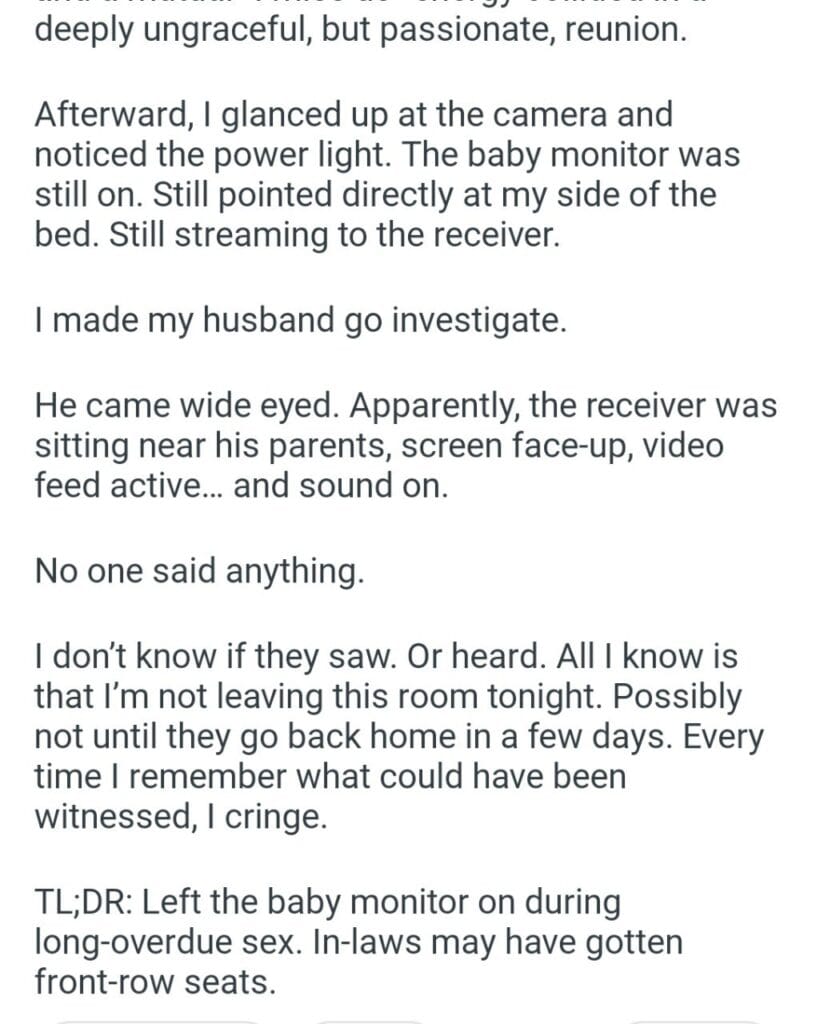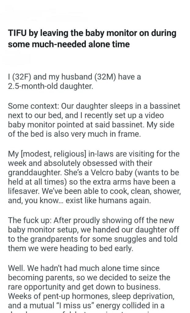 the baby monitor on Related Posts the way I for saying I will divorce my husband 600 a month attend family gatherings My husband’s son (28M) to friendsgiving resulting in their drama at our wedding my boyfriend’s proposal because with my family on Thanksgiving babysit his kid reminding my boyfriend after “joking” my client’s wife’s for preparing