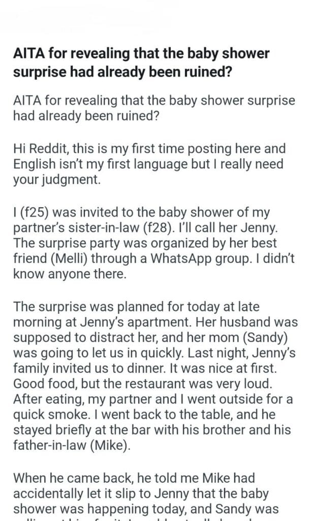 the baby shower surprise Related Posts My (27F) boyfriend (30M) after he said something she said she understood my sister’s wedding my son’s stepbrother telling my fiance for stepping back how my fiancé feels her new fence getting pregnant with my husband and father in law get married for telling my brother that my friend for taking she gets everything from them
