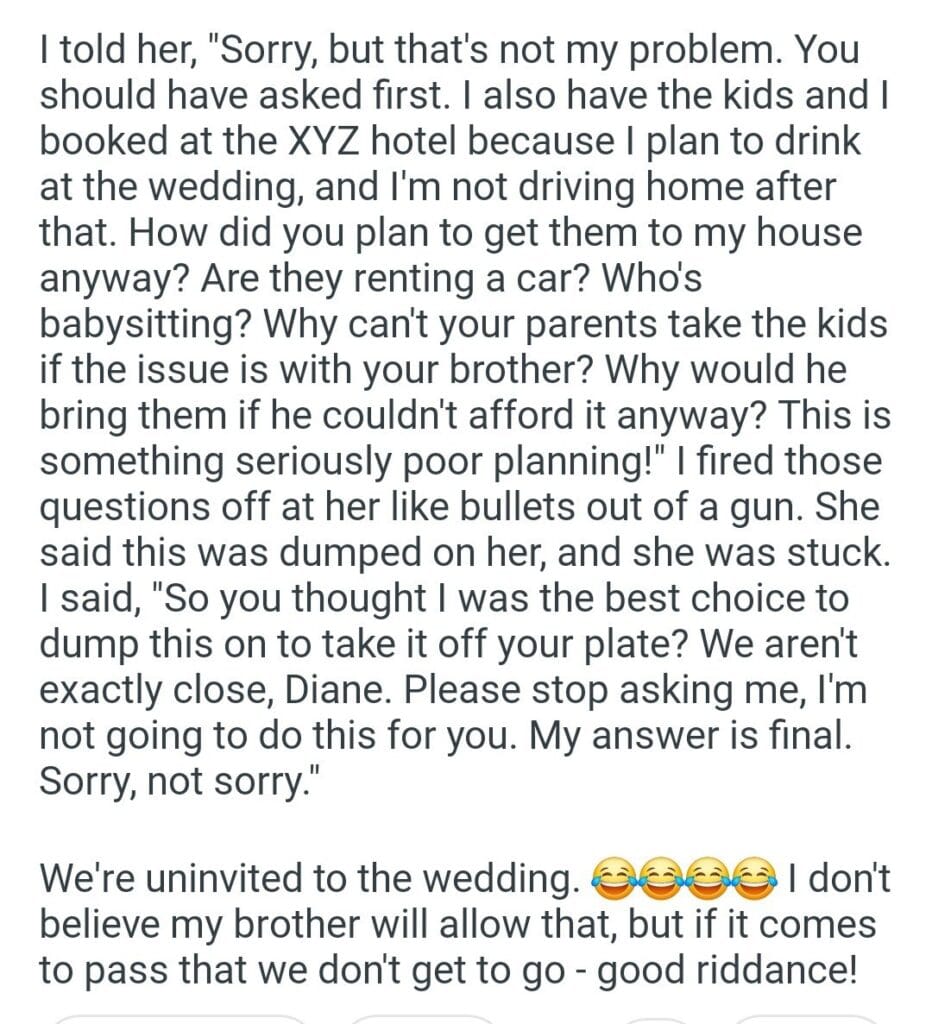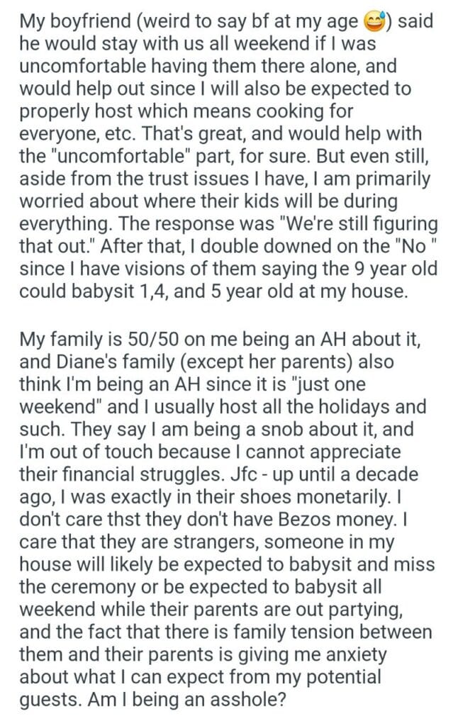 the wedding weekend ***Update Related Posts spend Christmas at home the same Christmas present friend’s daughter her company’s annual cousin’s pregnant gf even though I’ve always boss’s PTO knit at work my personal needs for what her grandparents said wife’s espresso giving my husband food babysit my sister’s kid a text I sent WIBTA if I called