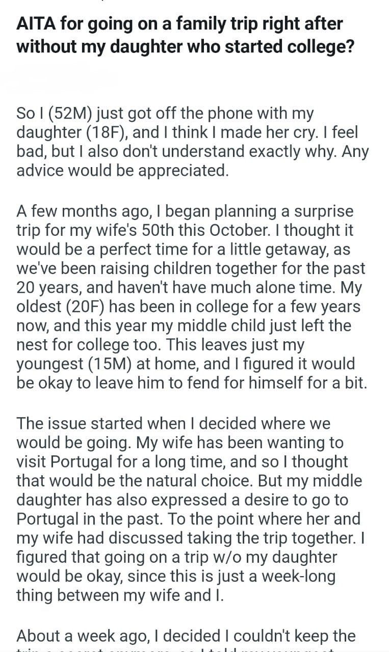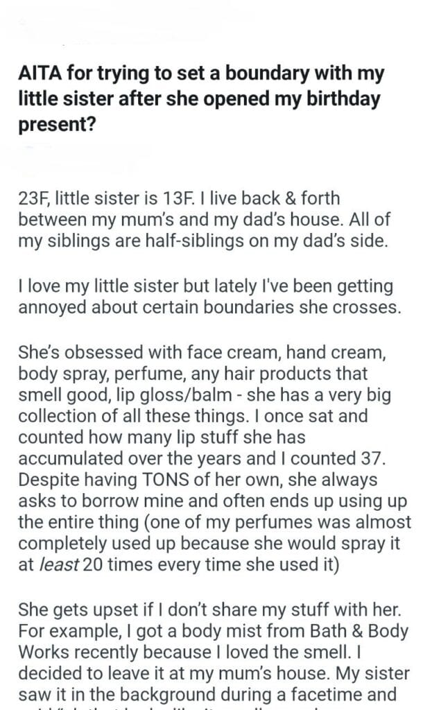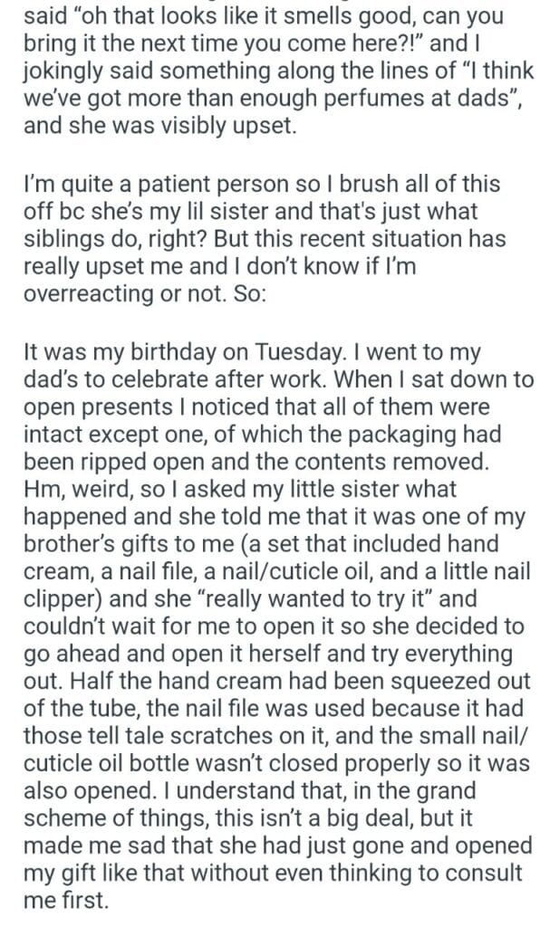 with my little sister Related Posts family trip right after when my husband asks me my MIL from my wedding my stepkids accounts my stepdaughter suggestion taking the kids to my parents my wife of 20 years My Cousin video My 24F husband 26M my stepkids that my kids AITA- I called my sis my cousin to announce her pregnancy my girlfriends dogs my baby for my dogs
