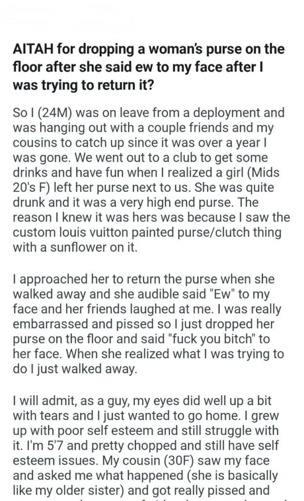 woman’s purse Related Posts even though I’ve always boss’s PTO knit at work my personal needs for what her grandparents said wife’s espresso giving my husband food babysit my sister’s kid a text I sent WIBTA if I called telling my friend’s bf say in this part with serious issues 100+ year-old heirloom Mechanic tries